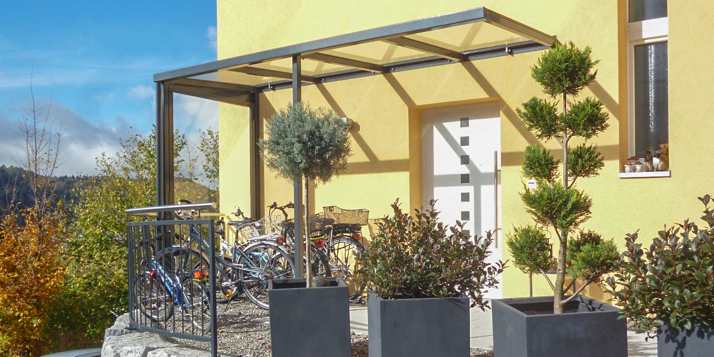 Mehr Schutz als ein Vordach alleine bietet eine Windschutzwand. Sie schafft einen Platz, an welchem z.B. Fahrräder abgestellt werden können, ohne dass sie der Witterung ausgesetzt sind.